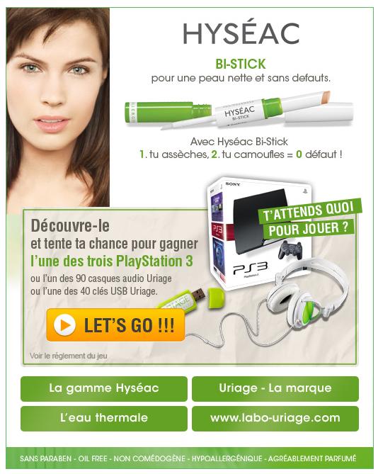 D’où Uriage. Et d’où Bon Plan. Uriage, c’est une marque de produits de beauté qui comprend la marque Hyséac, qui lutte contre l’acné. La page Facebook propose de tester une sélection de produits en vous adressant des échantillons et en profite pour faire gagner à l’un ou l’une d’entre vous une playstation 3 ou une clé Usb ou un casque audio.