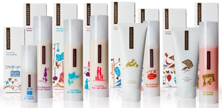 Snowberry marque son originalité par une gamme très complète dédiée aux yeux, une crème de nuit complète la quotidienne, des serums, un exfoliant, un nettoyant. Tout est fait afin de protéger la peau et l’hydrater au mieux, en minimisant les allergies et les intolérances. Le packaging est plutôt girly, coloré et axé sur des valeurs humanitaires : Images (famille, coeurs, nature …) et messages (« ex believe in goodness) transmettent des valeurs positives. Un détail qui compte.