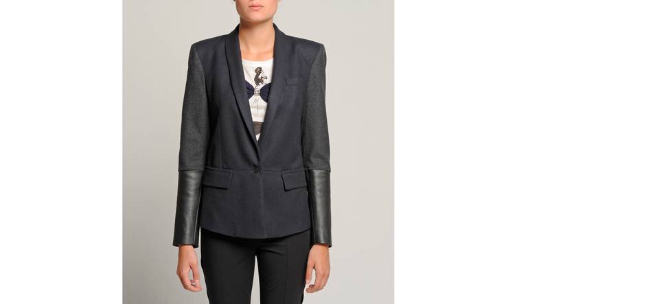Maje a su trouvé une veste un peu customisé puisqu’elle est à double matière. On a ajouté en bas des manches du cuir, ce qui lui donne une touche plus rock donc plus moderne. Portée avec un slim, elle est actuelle, bien dans son époque. Dédramatisée avec un tshirt à imprimé en noir et blanc, elle est terriblement tendance.