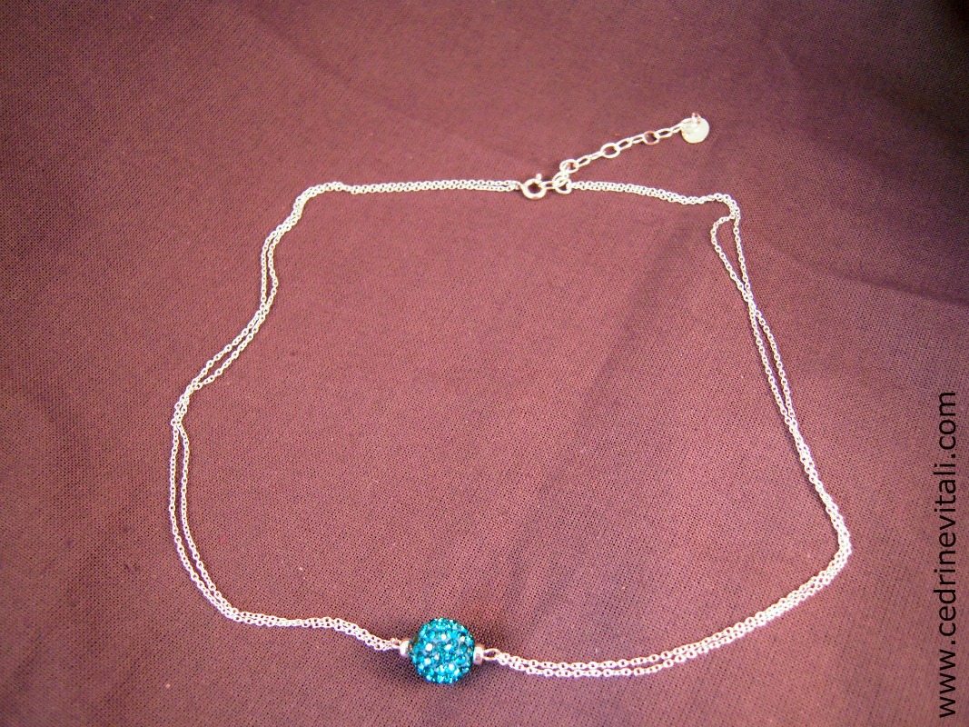 Description : Collier en argent, 39 cm réglable jusqu’à 44 cm. Chaine en argent doublée, perles en argent et perle en plasticine incrustée de strass.