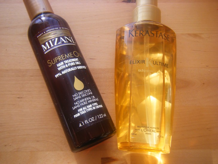 Se défriser les cheveux, comme avoir les cheveux secs, celà nécessite de l’entretien. En ce moment, j’utilise une huile pour cheveux afro + une huile pour tout type de cheveux. En alternance. J’ai choisi L’huile Kerastase Elixir Ultime et L’huile Mizani Supreme Oil.
