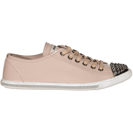 Voici une jolie association : le côté sportif + le côté girly + le côté rock. Miu Miu a choisi le pastel pour ses sneakers. Et pour calmer le jeu trop girly, Miu Miu a choisi des clous sur la pointe de ses baskets. Les sneakers quittent les stades et prennent un nouveau visage.