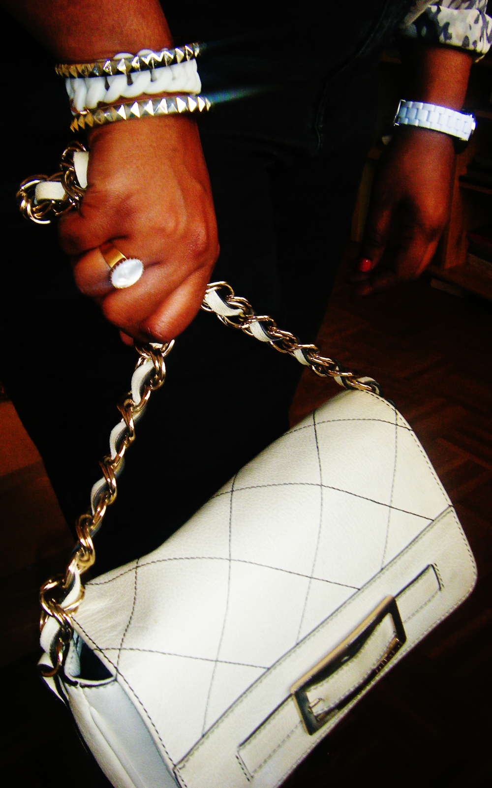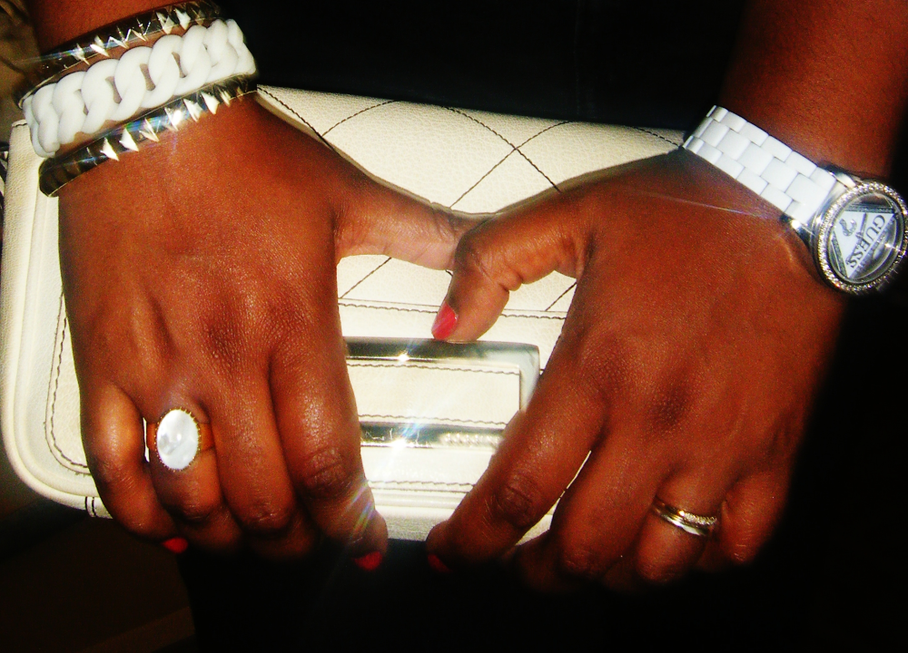 Bague Dear Charlotte, Montre Guess, Boucles d’oreille jaune Newlook, Bracelet blanc Marc by Marc jacobs, bracelet Newlook