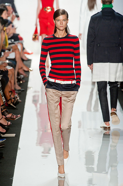 Couleurs vives, bicolores, rayures, Michael Kors a imaginé un printemps 2013 pétillant. Les couleurs sont la clé de voute de la collection : rayure et camaieu de couleurs s’entrechoquent et donnent une allure très élégante.