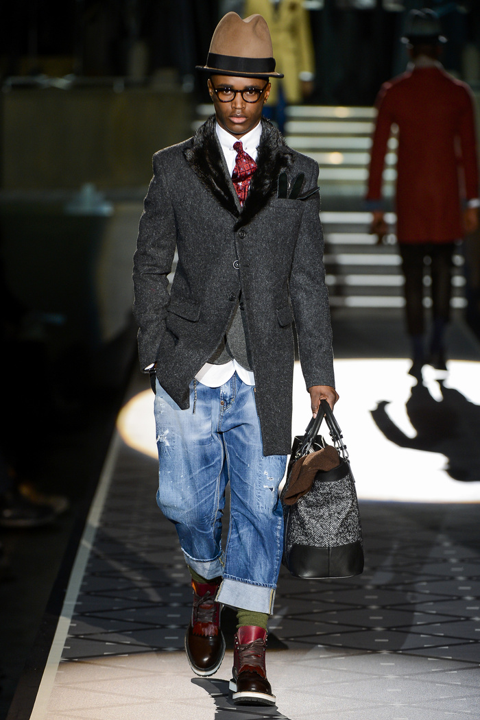 La silhouette proposée par les jumeaux Dean et Dan est un mixe entre le streetwear et le style dandy. On aime l’idée du jean déchiré avec le manteau. On aime aussi le port du chapeau comme nouvel accessoire de mode, à tort oublié.