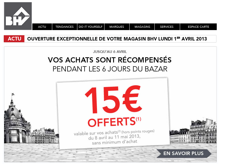 Et pour vous remercier, le BHV vous offre 15 € de réduction tous les 100 € d’achat. De quoi vous faire plaisir !