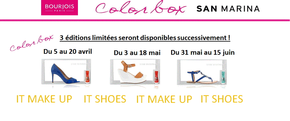 San Marina et Bourjois se sont associées pour lancer la Color Box. Quésaco ? La Color Box c’est un duo de vernis et une paire de chaussures. Il y a trois éditions limitées. Chaque modèle est différent : escarpin, sandales ou compensé. A chacune son style, à chacune sa paire de chaussures ! La première édition limitée a eu lieu durant le mois d’avril dans les boutiques San marina. Les « shoesista » ont pu s’offrir une splendide paire d’escarpins et un joli vernis Bourjois. Vous avez raté cet événement ? Pas de panique, deux autres éditions limitées vous attendent. La seconde a lieu du 3 au 18 mai 2013 et la troisième du 31 mai au 15 juin 2013. Donc soyez sur les starting block !