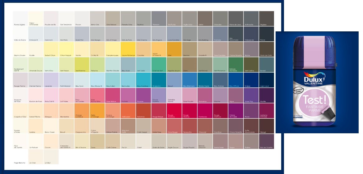 L’originalité repose sur des petits échantillons munis de pinceaux, Test! Il s’agit de pouvoir tester toutes les couleurs qui nous plaisent avant de faire notre choix. On essaie puis, on valide.