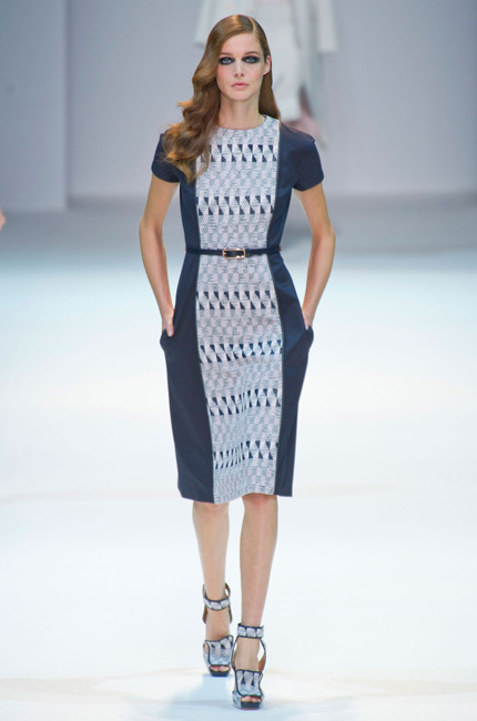 On prend comme modèle la robe de Guy Laroche. Elle fait l’effet d’un trompe l’oeil sans donner l’impression qu’on a délibérément voulu tricher. On trouve un imprimé graphique, une robe pas trop longue (au dessus des genoux ou au genou). On évite les robes trop longues afin d’éviter l’effet « je me cache ».