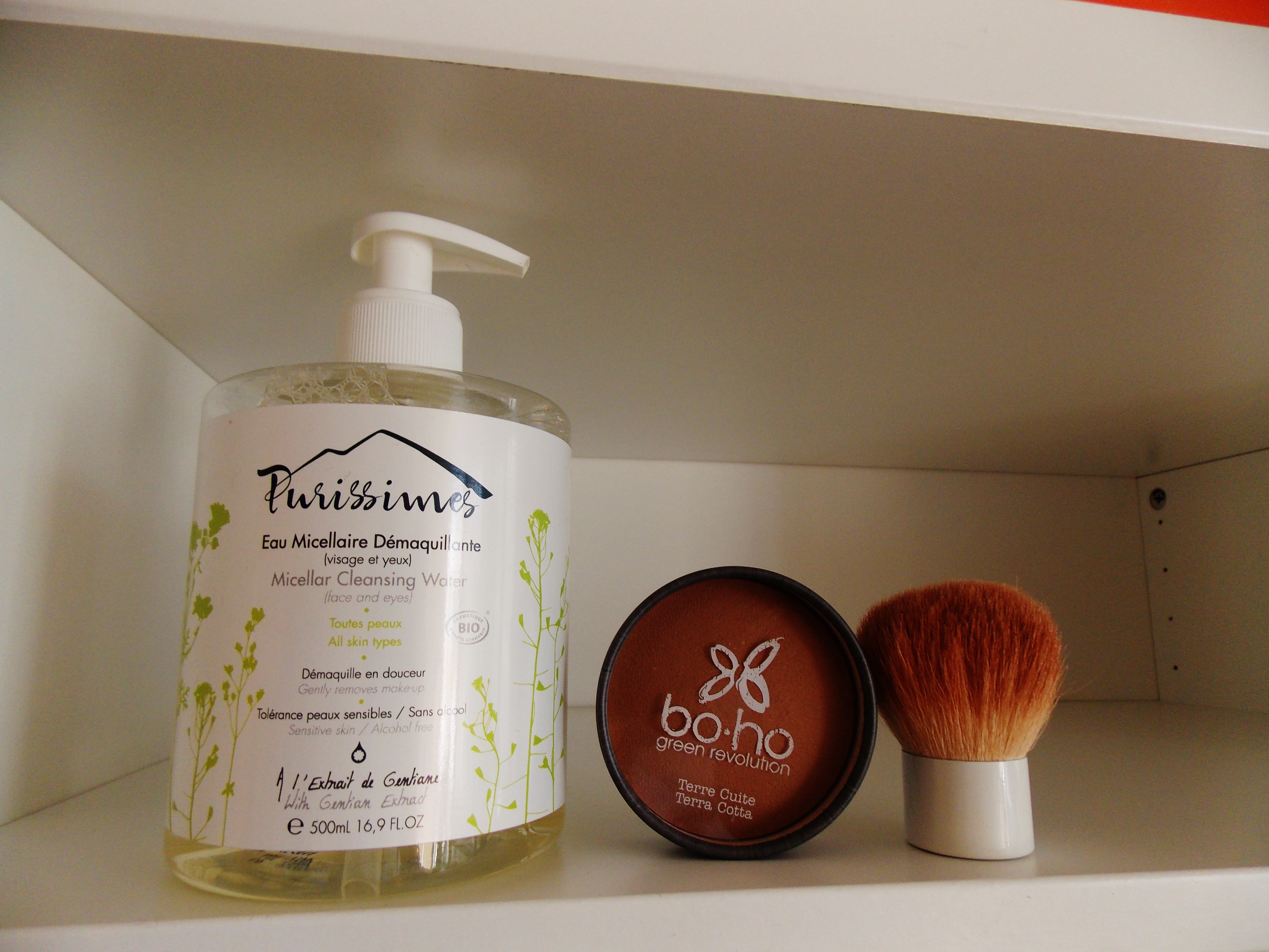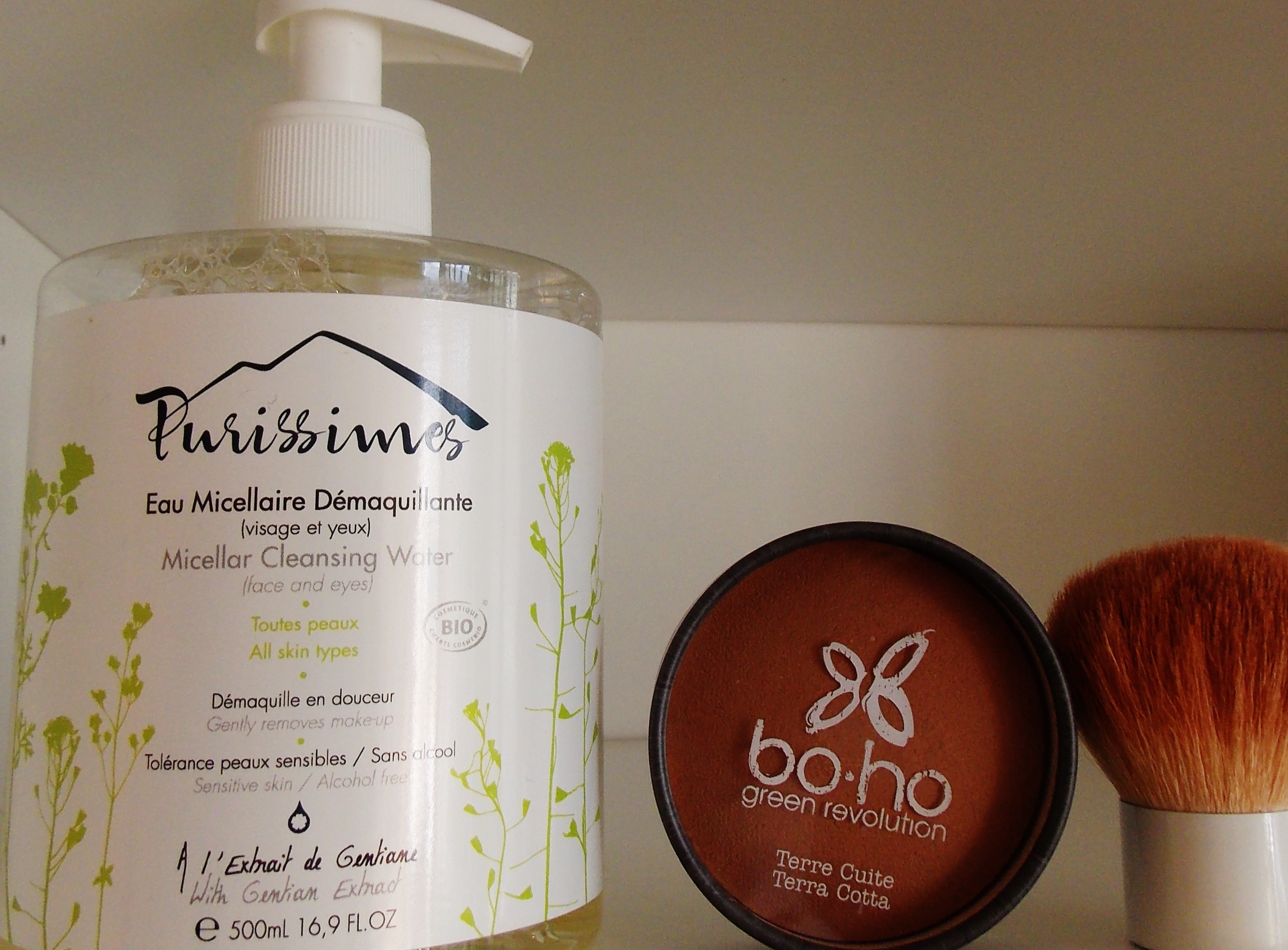 1/ un démaquillage le soir avec l’eau micellaire démaquillante Purissimes. Je l’utilise comme lotion le matin avant la crème et le maquillage. L’eau micellaire est sans alcool ce qui est parfait pour l’été. Les lotions alcoolisées sont à fuir.