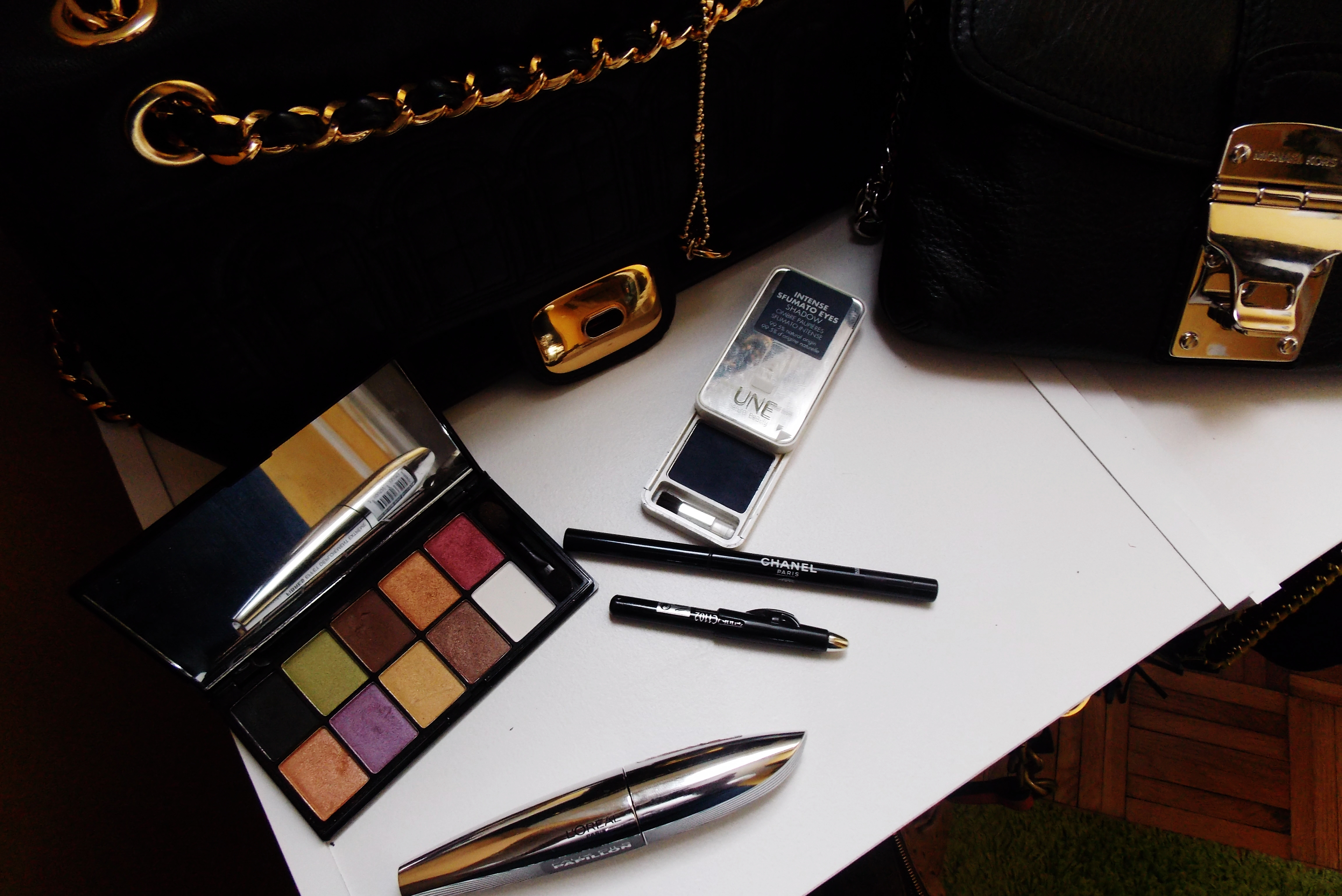 Les ustensiles : Un fard bleu (Une Beauty), un crayon noir (Chanel), un eye liner waterproof (Chanel), la palette NYX cosmetics pour le fard mauve.