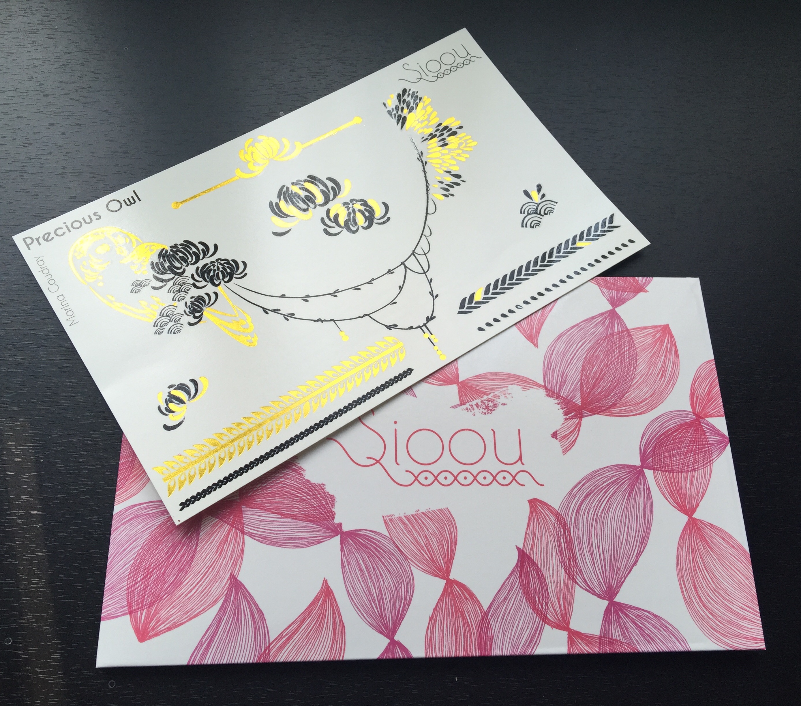 Les tatouages temporaires de Sioou sont de magnifiques bijoux de peau (colliers, bagues, bracelets, bijoux de cheville,…). Créés en France, en collaboration avec de véritables artistes (peintres, graphistes et illustrateurs), ils font l’illusion de parures sur votre corps. A vous de choisir les ou les endroits que vous souhaitez mettre en valeur, tout est permis !