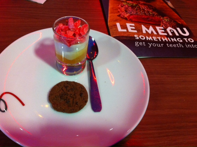En plus d’y avoir dégusté des entrées, plats et desserts très goûteux, nous avons eu l’occasion de boire une coupe de Champagne Taittinger (également proposé sur la carte) et de goûter deux des plats de saison qui était présentés et servis par Maxime Desaigle le gagnant du concours national des chefs Campanile : une cocotte de veau français et un tian de légumes provençal.