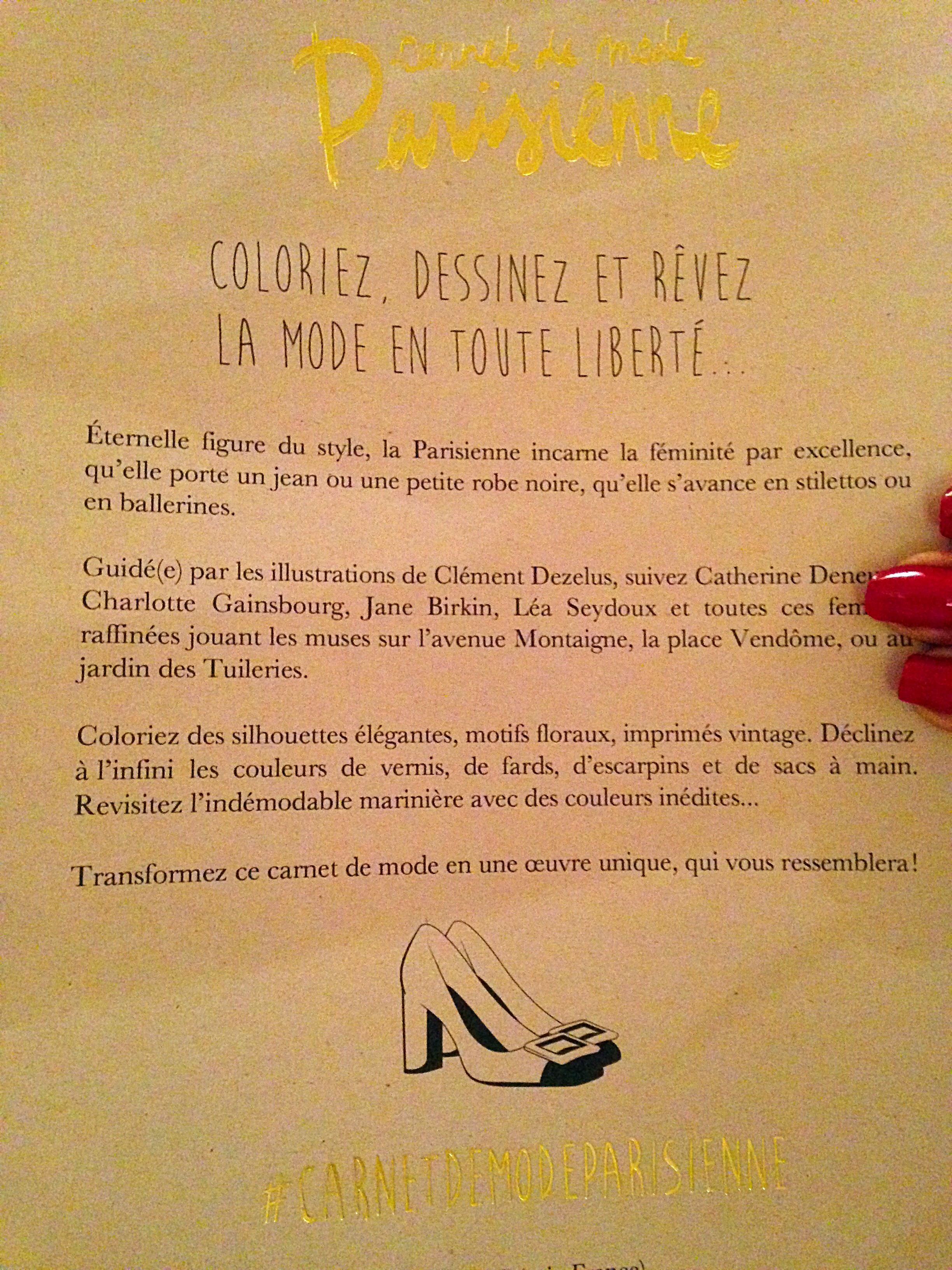 Dans le Carnet de Mode Parisienne, des silhouettes, des situations qui vous parleront certainement. A l’image de la première page de couverture. Certains vêtements et accessoires vous rappelleront des créateurs de mode et vous donneront peut être envie de porter la panoplie de la parisienne accomplie, intemporelle et sure d’elle.