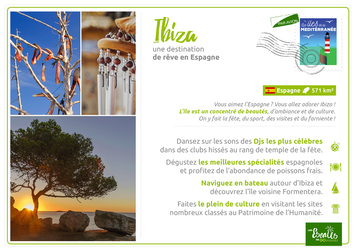 Valstarts n’aimant pas l’avion, il faudrait une destination proche comme la méditerrannée. Et pour lui donner envie de passer le cap, j’opterai pour une île paradisiaque. Autant je suis déjà allée aux Baléares, autant Ibiza, je ne connais pas. On m’en a dit que du bien : décompresser, faire la fête, s’amuser, nager, bronzer, faire du bateau. Ça m’a l’air génial !