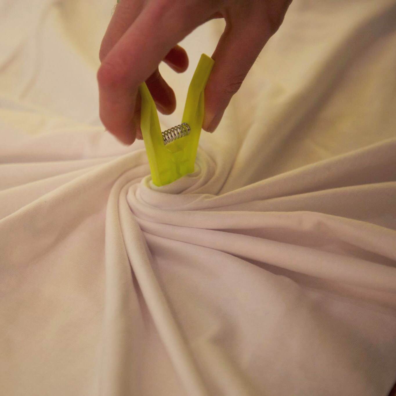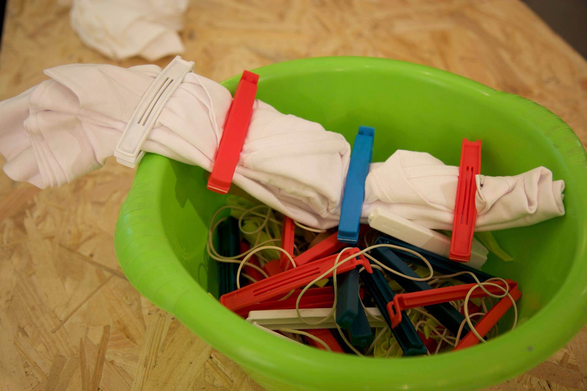Véronique nous a fait découvrir Le Shibori une technique japonaise qui signifie « serrer en tordant ». Pour ce faire, les invités tournaient le t-shirt autour d’une pince à linge jusqu’à obtenir une forme ronde, le plongeaient dans un bain de couleurs durant quelques minutes, un petit passage dans la machine à laver et vous obtenez une création unique et originale.