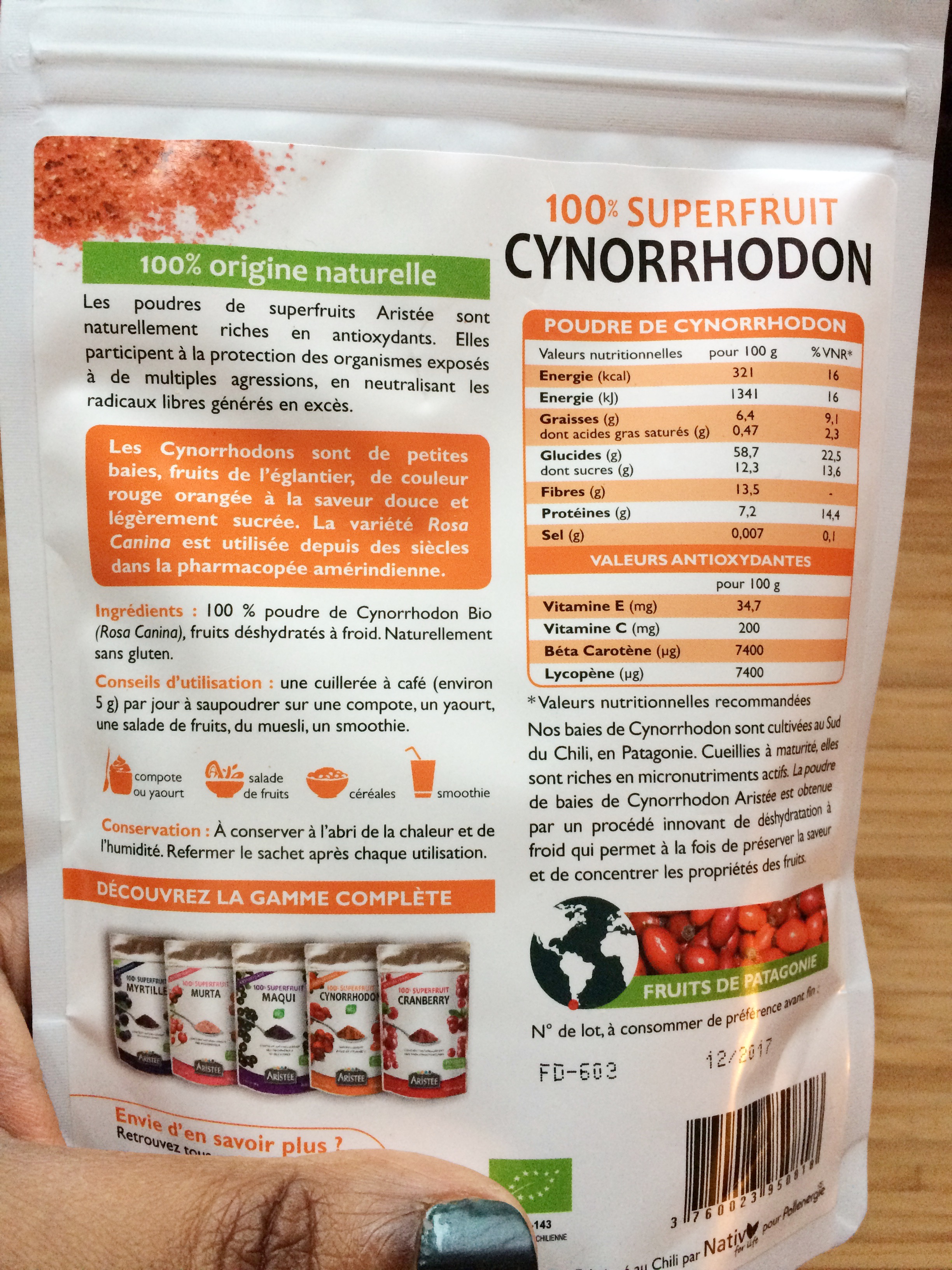 Les baies de goji sont un excellent anti-oxydant tout comme la poudre Aristée, 100% superfruit. Ma poudre est composée de cynorrhodon. Le cynorrhodon est le fruit de l’églantier, riche en vitamine C, il est un pro pour renforcer les défenses immunitaires.
