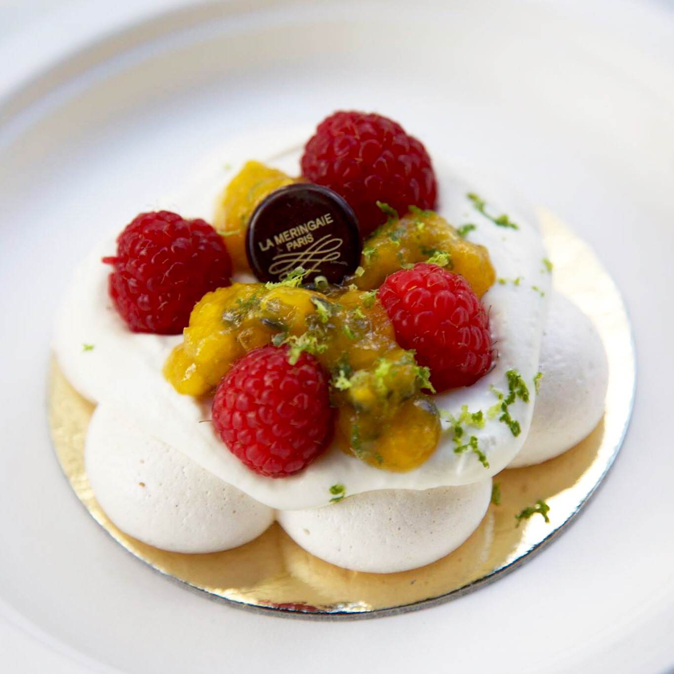PÉLAGIE : Crème fouettée à l’infusion de citron vert, framboises et fruits de la passion. Une divinité, un voyage gustatif inoubliable, énorme coup de cœur.
