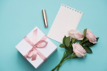 Mother’s Day concept. Bouquet of pink roses with gift box and lipstick. Blank paper note for copy space.