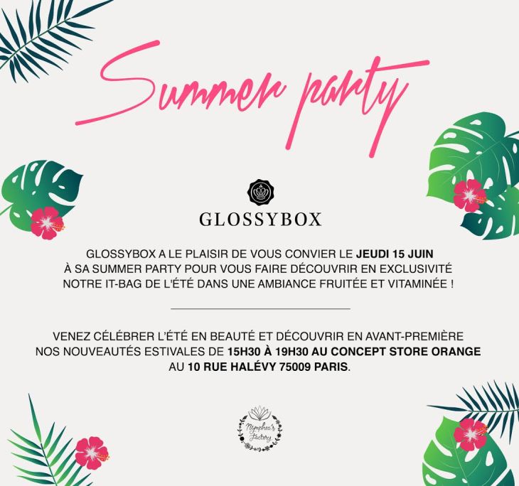 La célèbrissime Glossy Box pose ses valises dans un décor de rêve le 15 juin à partir de 15h30, pour vous faire découvrir la Summer Box qui fera sensation cette été, différentes animations comme des ateliers beauté, bar à jus de fruits, corner bonbons et la fabuleuse marque Dr Brandt sont prévus.