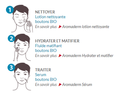 Destinée aux peaux grasses, la gamme Aromaderm est composé d’un trio, qui en les combinant permet de mettre ko les peaux grasses et à tendance acnéique. La solution contre les boutons disgracieux passe peut-être par l’aromathérapie. Le trio se complète, la combinaison des 3 décuple l’efficacité du traitement.