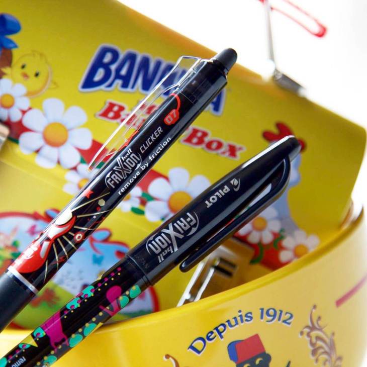 Limitées à 400 000 exemplaires et disponible dans les rayons des supermarché, deux modèles en noir et en bleu (FRIXION Clicker) et (FRIXION Ball), la marque ne s’arrête pas là. Attendez-vous à une vague de folie comme un stylo FRIXION de 2 mètres de haut ou des trousses géantes présentant toute la gamme. Ne passez pas à côté des Stickers et les affiches de couleurs.