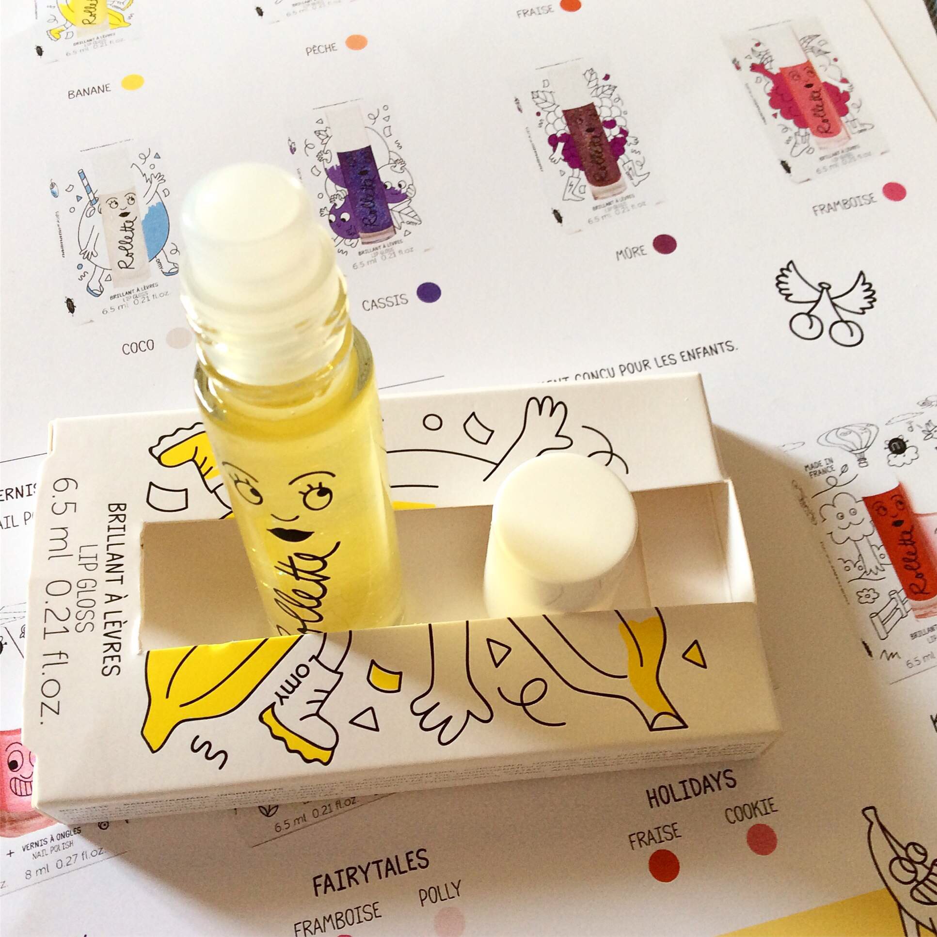 Un packaging Girly mettant en valeur le brillant à lèvres, on distingue clairement que cela est destiné au Kids. Des senteurs gourmandes comme la Banane, Fraise, Cerise, pomme, Coco, framboise … sont disponibles.