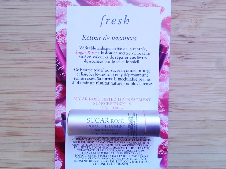 Troisième produit cosmétique : le baume teinté, Sugar rosé, de la marque américaine Fresh avec son indice SPF 15. Les baumes sont vendus chez Sephora et il y a 14 couleurs. Hydratation et lèvres douces garanties.