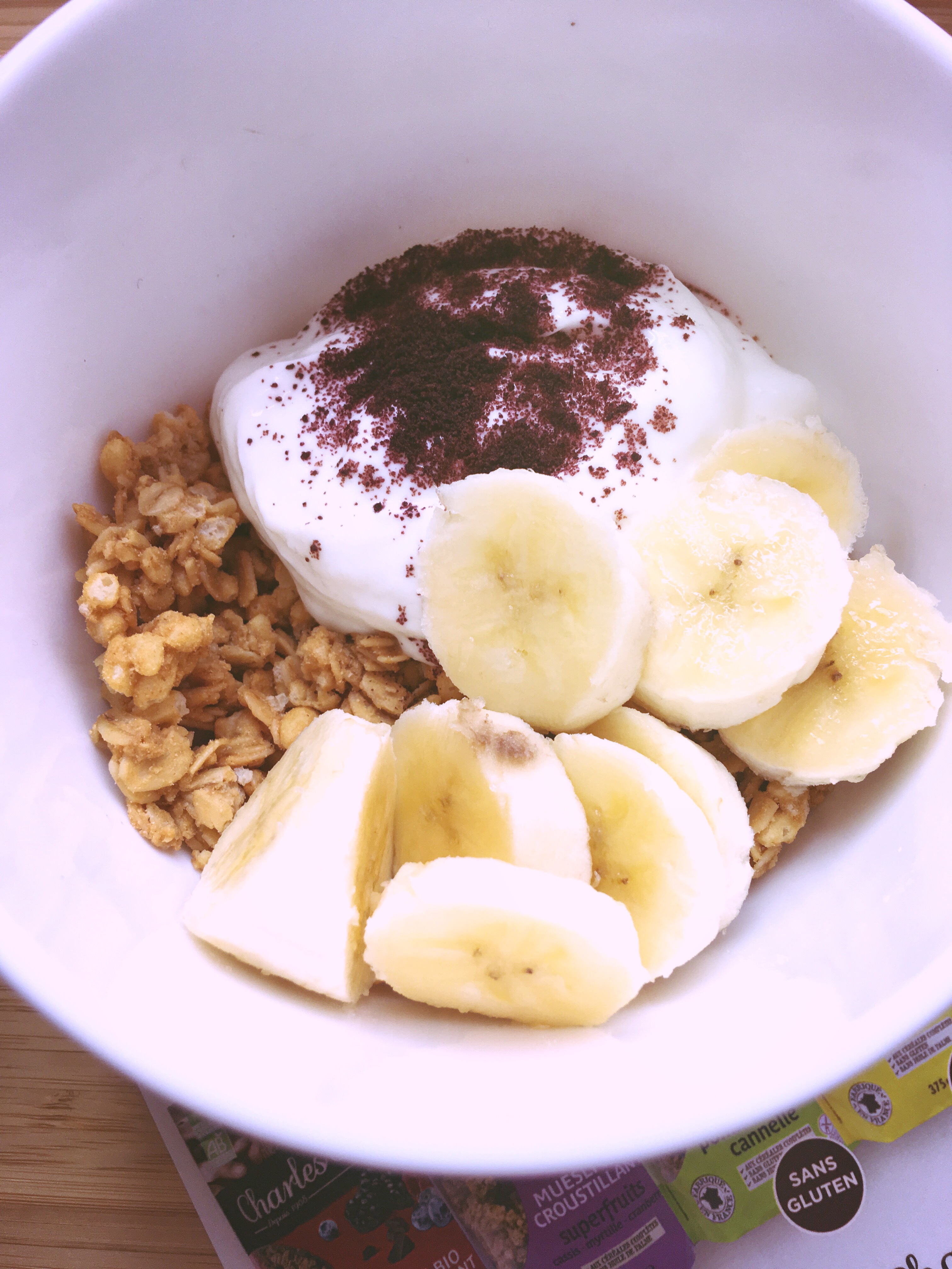 Ma recette : une demie banane, de la poudre d’acai, du fromage blanc et les céréales bio Charles Vignon.