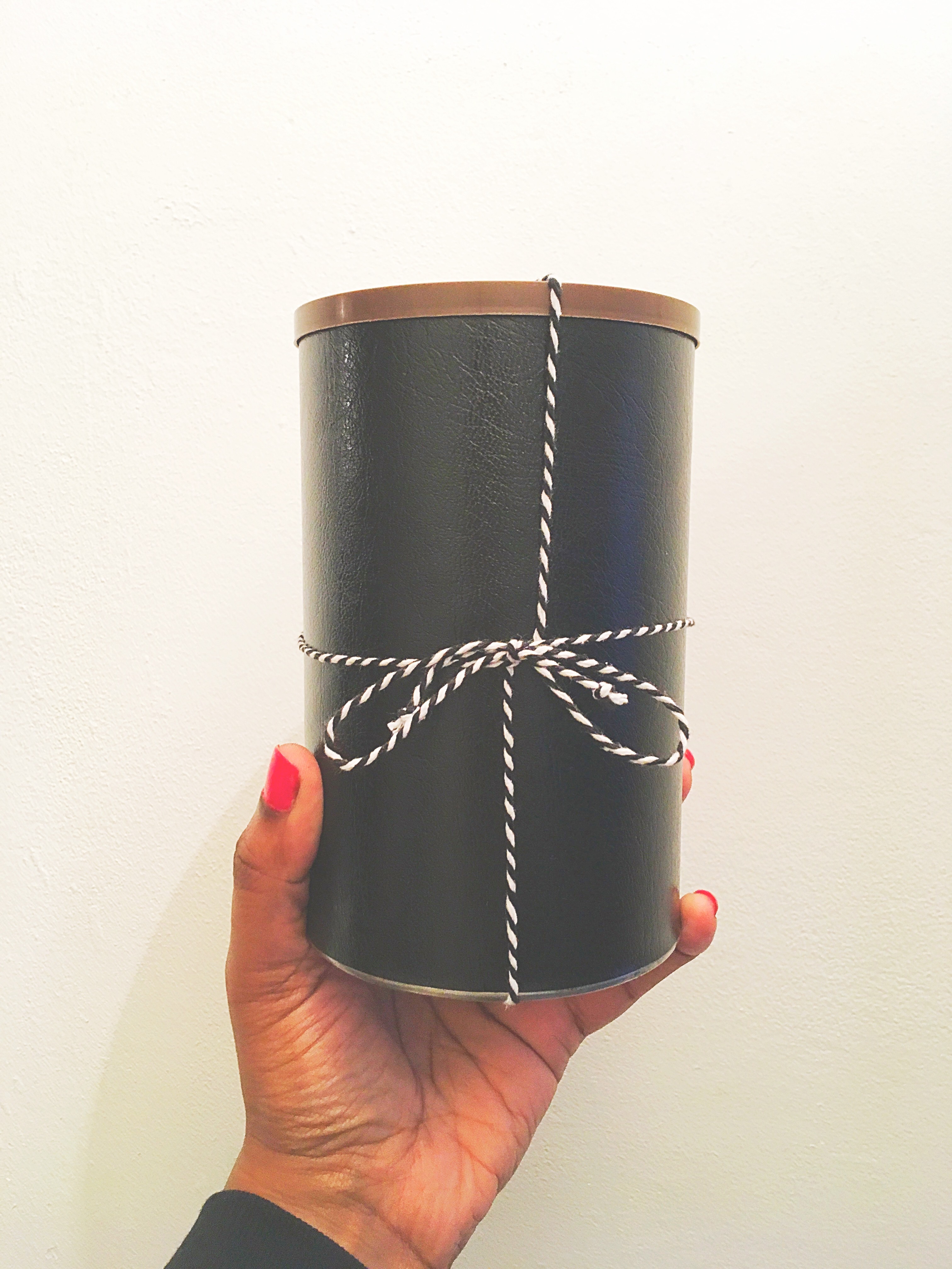 On colle du papier venilia. J’ai choisi le papier type cuir mais il existe d’autres papiers plutôt sympas : or, tableau blanc, croco, aluminium brossé … etc. On peut colorer à la bombe de peinture le couvercle ou laissez tel quel et coller quelques stickers. Ajoutez des rubans ou du fil coloré que vous maintiendrez avec un peu de scotch, en dessous.