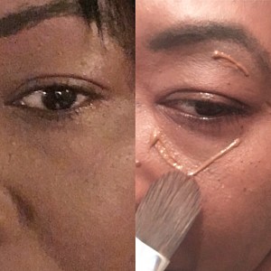 Du coup, pour éclairer, il faut une teinte en dessous de sa carnation même légèrement. Pour la pause, ayez la main légère pour éviter de trop marquer l’œil et l’épaissir. Un pinceau est parfait. L’anti-cerne doit donner de la luminosité au visage.
