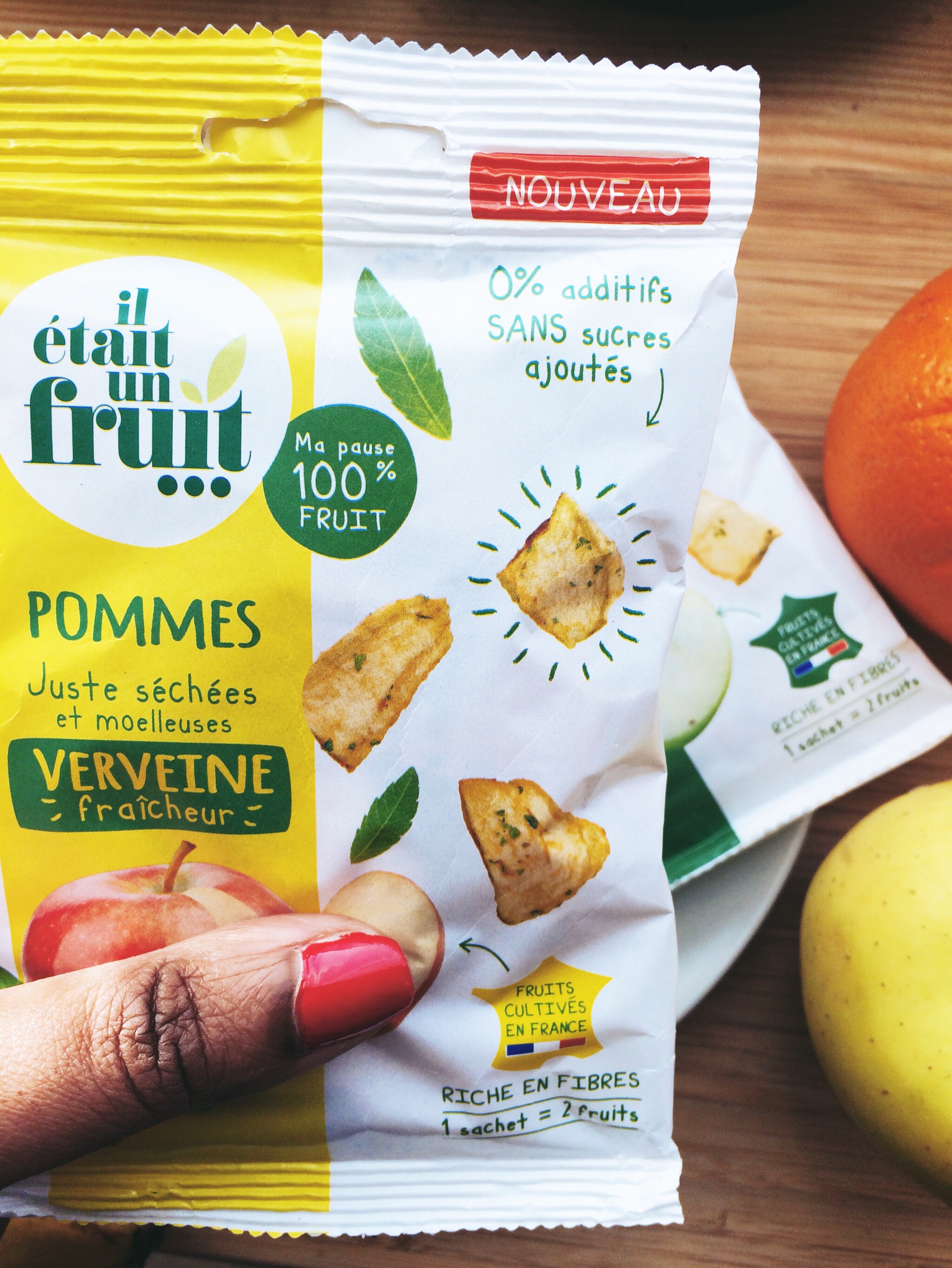 A l’intérieur du sachet, les 2 fruits certes mais surtout des saveurs puisque le fruit est préparé avec des aromates comme la verveine et la menthe. Cela se mange comme des chips, les vitamines et les fibres en plus, sans les calories. Un sachet ne dépasse par les 94 calories, comme je l’ai dit plus haut.