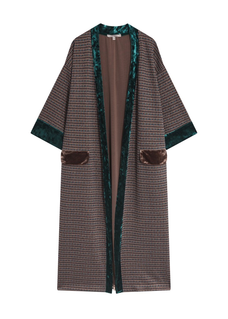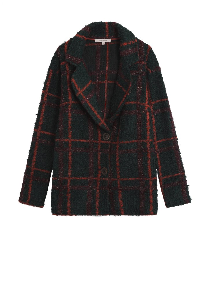 On est surpris par : le manteau pied de poule et son détail velours qui se marie très bien. Sur le papier, le mixe des matières parait risqué mais en réalité, le match est réussi.