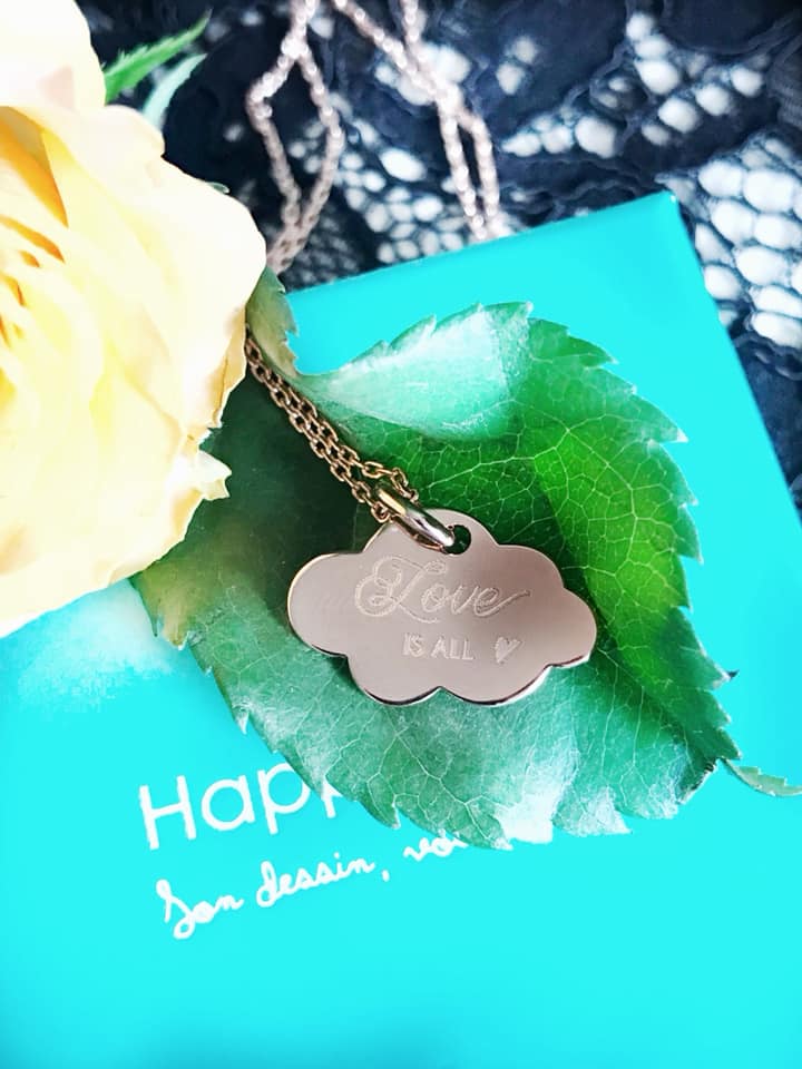 J’ai choisi un pendentif médaille gravée plaqué or rose (18k avec poinçon )en forme de petit nuage, avec une longueur de chaîne 70 cm, existe aussi en 45 cm, le médaillon est personnalisable recto et verso. Plusieurs possibilités vous sont proposés sur le site.