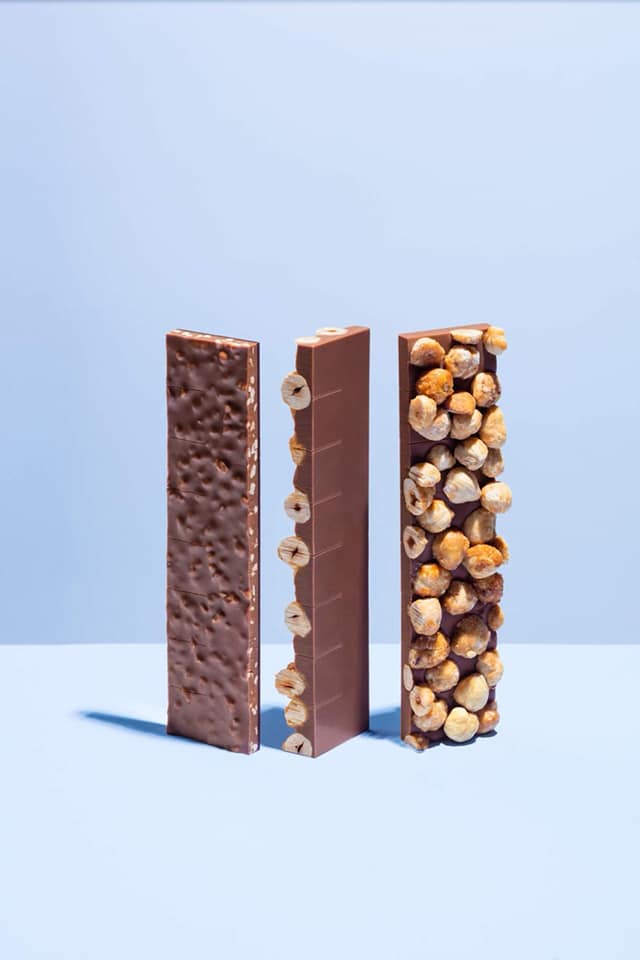 Dans nos désirs régressifs, les noisettes du chocolat sont demeurées, le chocolat blanc tremble de riz soufflé et le mendiant s’évanouit sous une avalanche de chocolat. Trois tablettes de franche convoitise pour attiser la gourmandise.