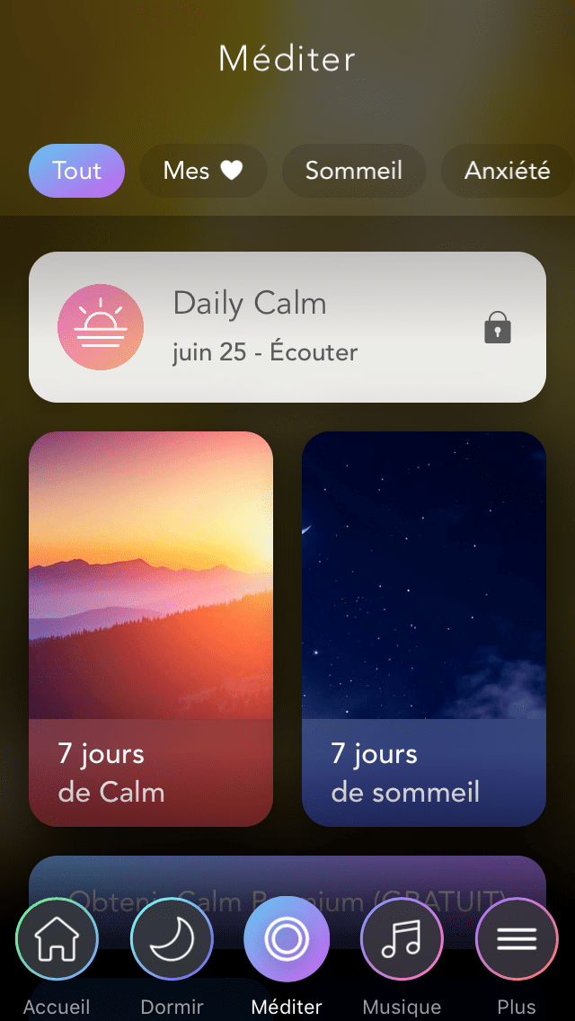 Calm c’est un accès gratuit et un payant (premium). Pour avoir accès à la totalité du guide de méditation, c’est 49,99€ par an.