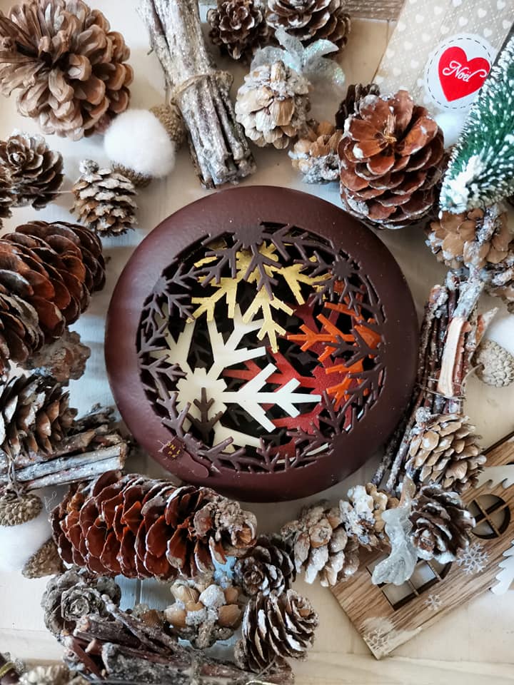 Sans oublier bien entendu la traditionnelle Bûche Étoile De Neiges en taille unique 6/8 personnes, mousse chocolat Madagascar, poires fraîches pochées, confit de cassis noir de Bourgogne, palet de ganache Madagascar, biscuits roulade chocolat aux graines de cassis, éclats de strusel chocolat à la pointe de sel. Décoration de 9 flocons de neige ouvragés en chocolat enserrant la bûche. Finition chocolat noir brillant et satiné, lait satiné feuille d’or, velours ivoire.