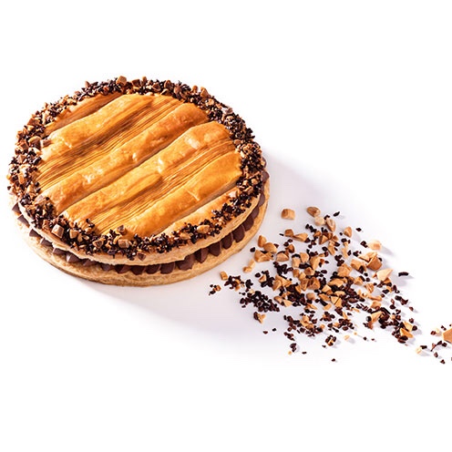 Feuilleté Maison pur beurre extra-fin, ganache moussée de chocolat noir des Caraïbes à 66%, amandes caramélisées hachées. Décor d’amandes grillées de grué de cacao.