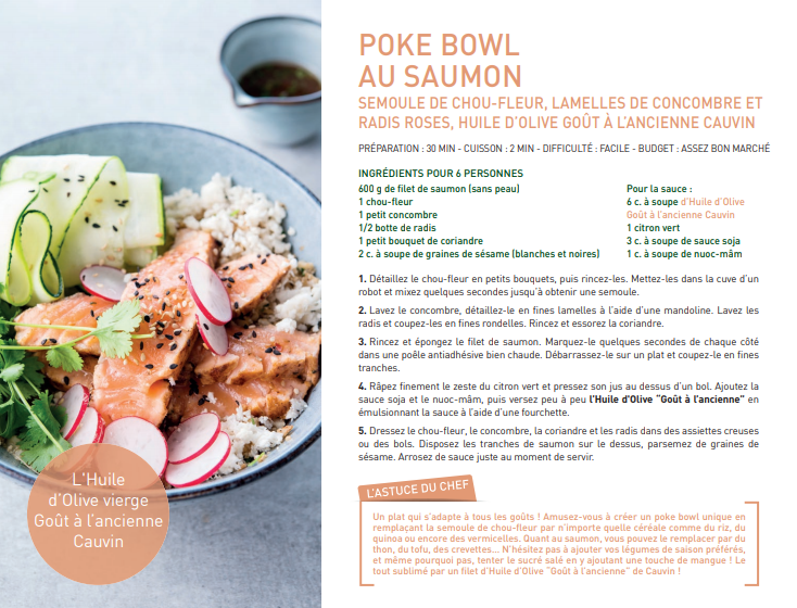 Pour finir avec cette présentation, voici quelques recettes élaborées avec les huiles « Les Savoureuses » : POKE BOWL AU SAUMON et SALADE VERTE AUX LENTILLES DU PUY.