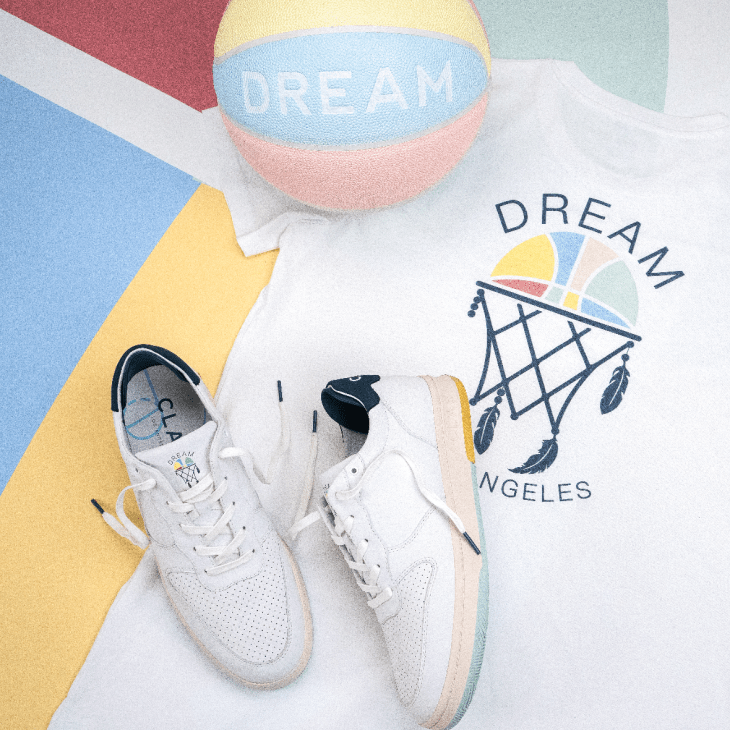 Cette collaboration entre LE BON MARCHE et CLAE comprend une communication autour de 2 paires de basket, un tee-shirt ainsi qu’un ballon de basketball reprenant la thématique de l’attrape rêve. C’est une référence à la culture de rue de Los Angeles, notamment un rappel concernant le terrain de basketball que l’on voit à Venice Beach. Si vous y êtes allées, cela est forcément parlant pour vous.