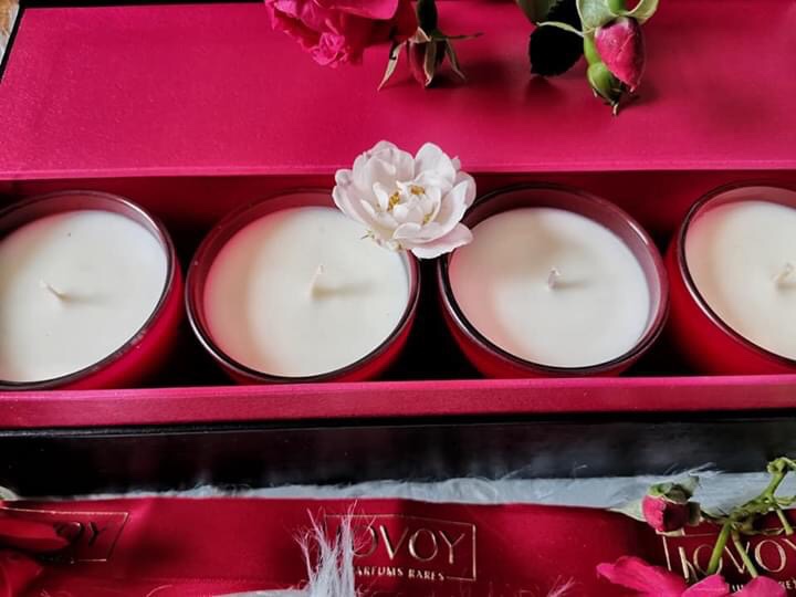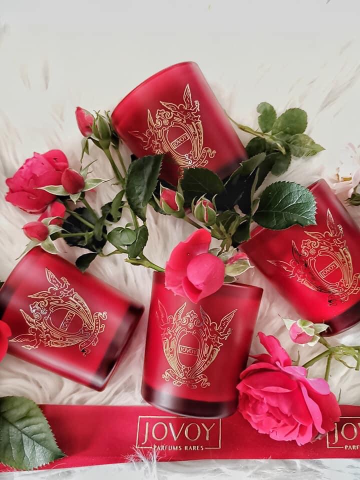 Et pour terminer sur une note de douceur, un splendide coffret de quatre bougies, dans un contenant rouge bordeaux estampillé avec le symbole JOVOY en doré.