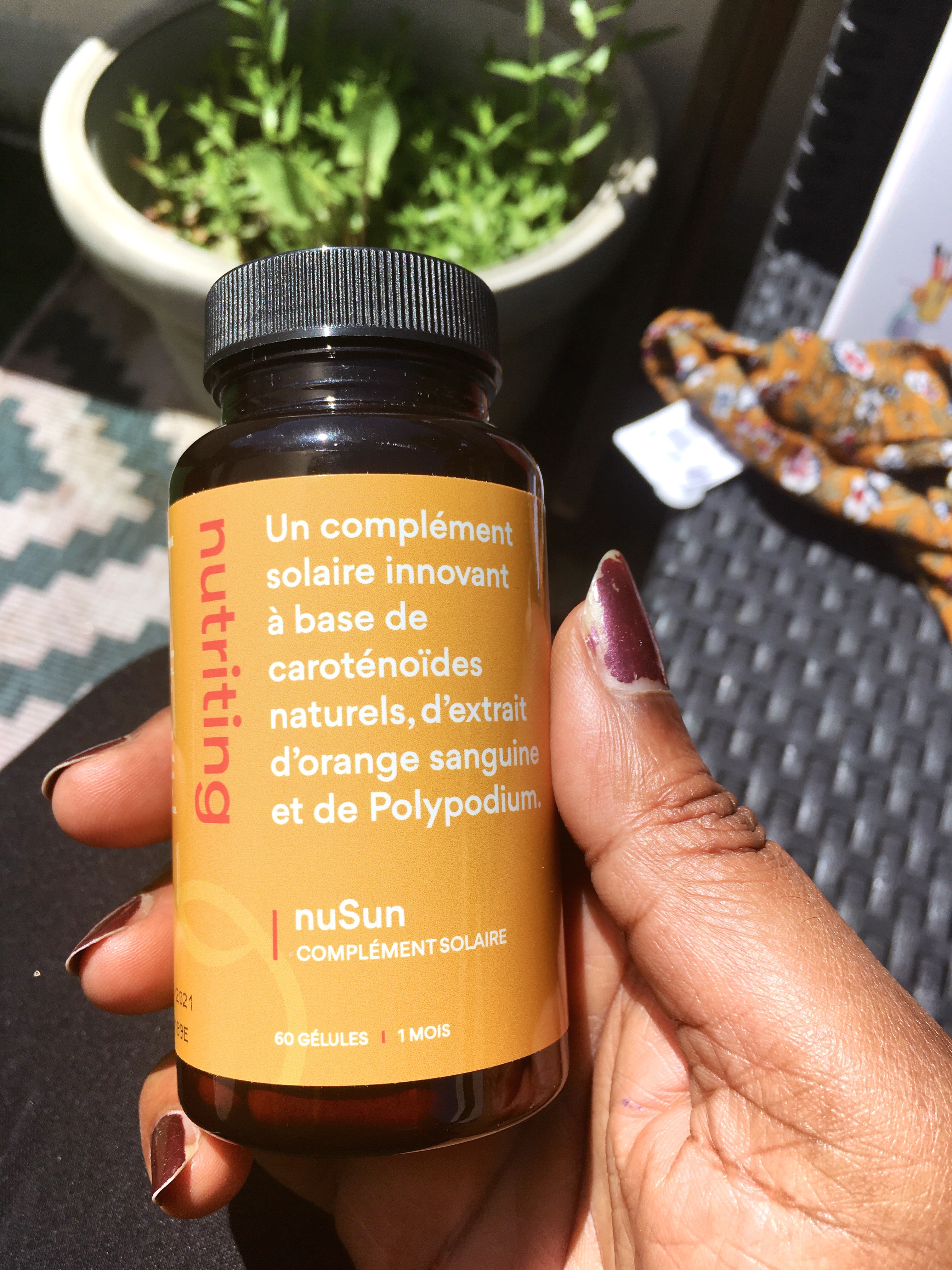 Nutriting a pour allié le NuSun, un complément alimentaire à prendre chaque jour et qui est 100% naturelle & végétale puisqu’il contient des caroténoïdes, orange sanguine, polypodium.