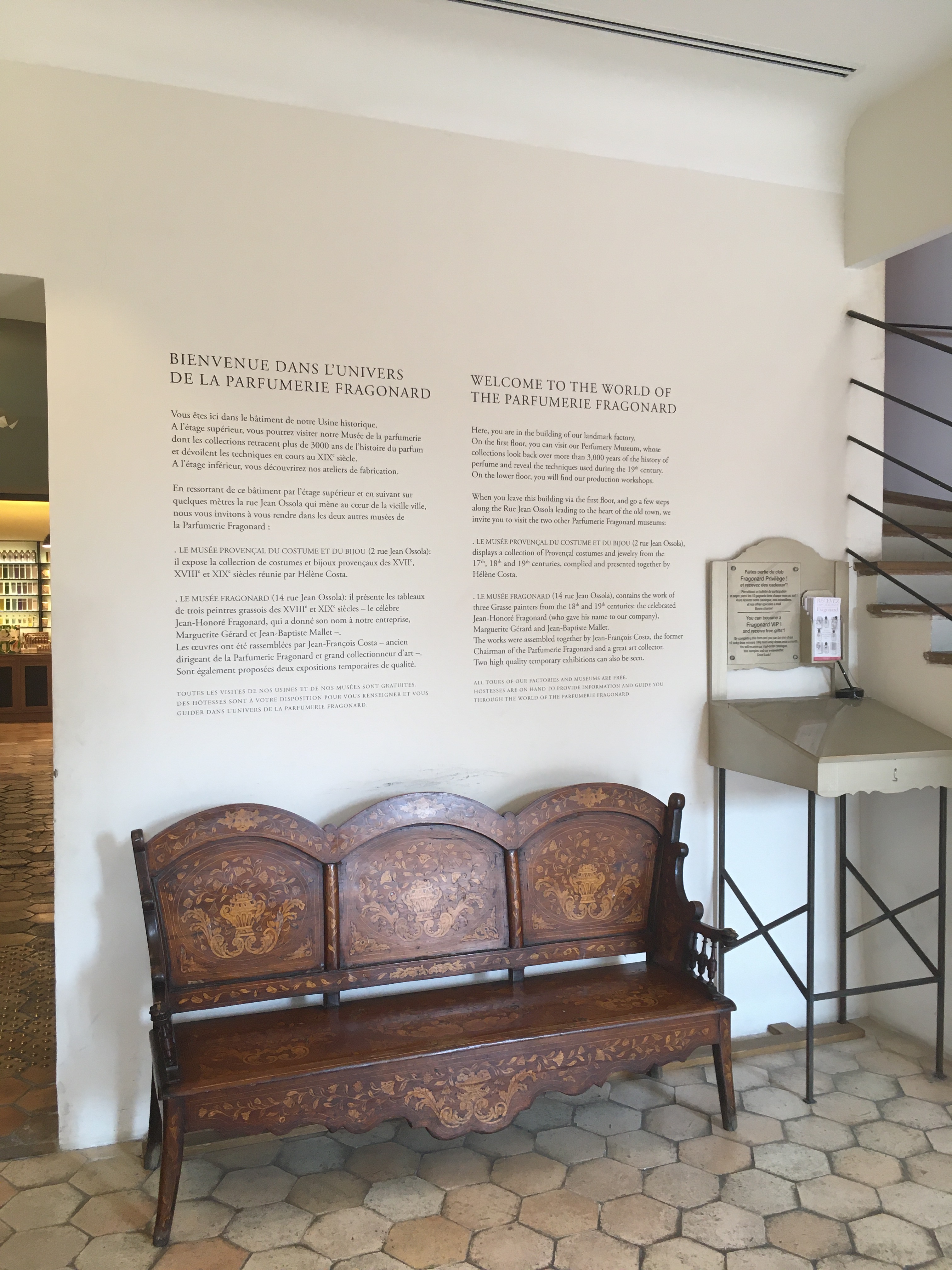 L’histoire de Fragonard commence en 1880 avec son usine. Puis, l’aventure commence avec la parfumerie et le succès qu’on lui connait. Le bâtiment est du pur style dans des grandes demeures grassoises du XVIIIe siècle. Le lieu est superbe et vaut largement le détour. D’ailleurs, on le remarque immédiatement.