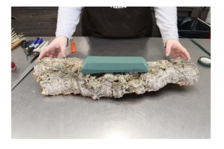 Étape 1 : Commencez par mettre un peu d’oasis fix sur les pins holder et faites-le chauffer avant de fixer l’ensemble sur l’écorce. Deux pins holder ainsi fixés seront suffisants pour soutenir la structure.