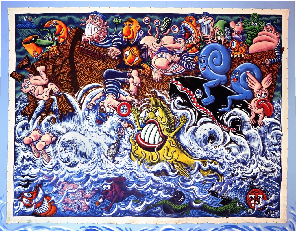 Le MAAT de Lisbonne expose l’artiste Hervé Di Rosa dont les œuvres sont présentées au musée international des arts modestes à Sete. Une œuvre majeur nous intrigue. Il s’agit de tous en bateaux une des peintures qui tournent autour du voyage, conçue en 1988.