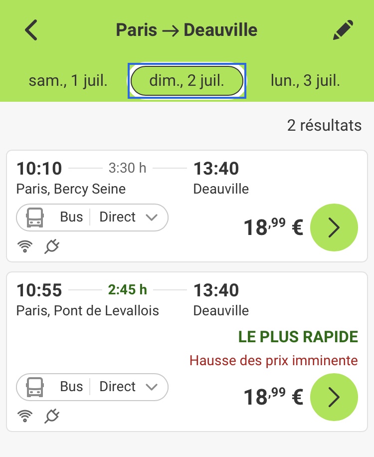 - Un trajet en bus pour une journée de vacances avec flixbus. Les tarifs sont compétitifs comme pour cet aller simple pour Deauville à 19€.