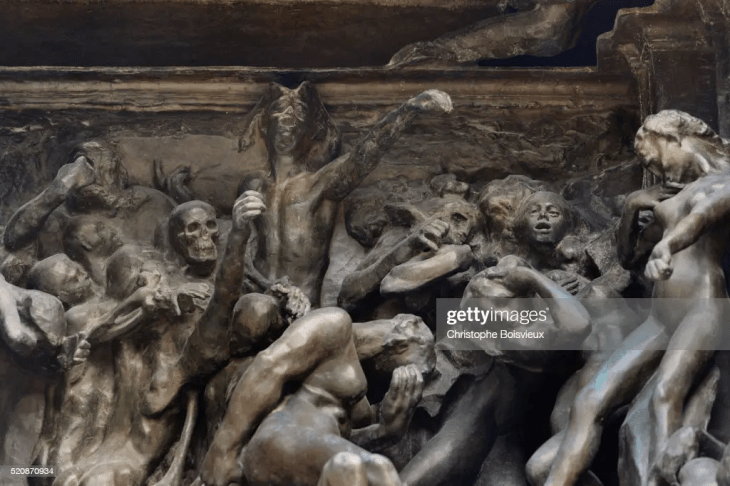 Dante Alighieri dit Dante (1265-1321) a rédigé la Divine Comédie entre 1303 et 1321. Nous savons que Dante planait au dessus de Rodin lorsqu’il a conçu l’œuvre : une représentation de l’écrivain italien en pleine réflexion sur la nature des enfers. Le livre détaille le paradis, le purgatoire et les enfers. C’est sur le chapitre des enfers que Rodin travaille pour concevoir une porte des enfers, empreinte de mythes et de croyance religieuse.