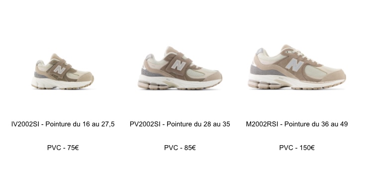 Et j’opte pour New balance, la marque qui monte. Cette fois-ci, je craque pour le modèle 2002R, en mesh beige et suède sable et gris. Et il y a même la version mini me.