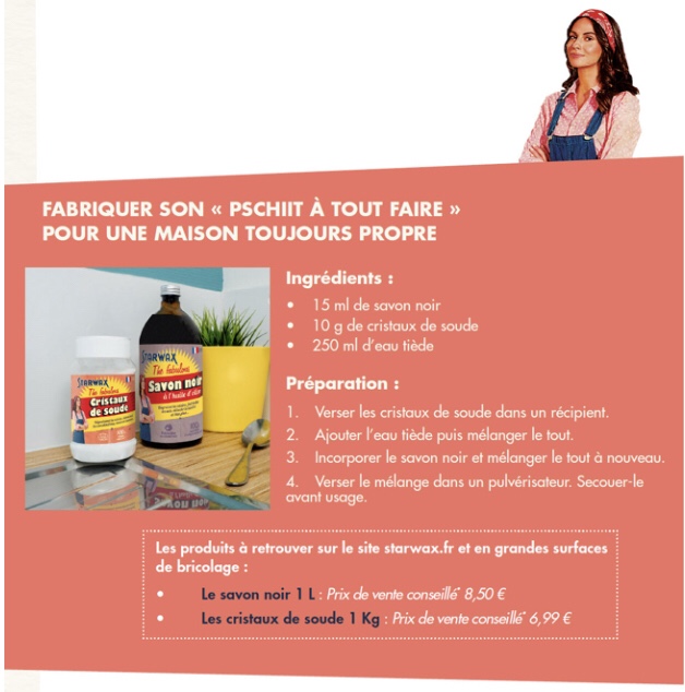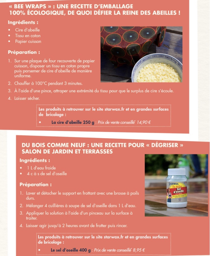 Économiser en fabriquant ses produits d’entretien pour la maison c’est sympa pour le portefeuille mais c’est aussi parfait pour la planète. Starwax a partagé 4 recettes pour mettre à profit notre créativité. Ceux et celles qui aiment fabriquer des choses avec leurs mains seront servis avec ces 4 fiches recettes ci dessus et dessous.