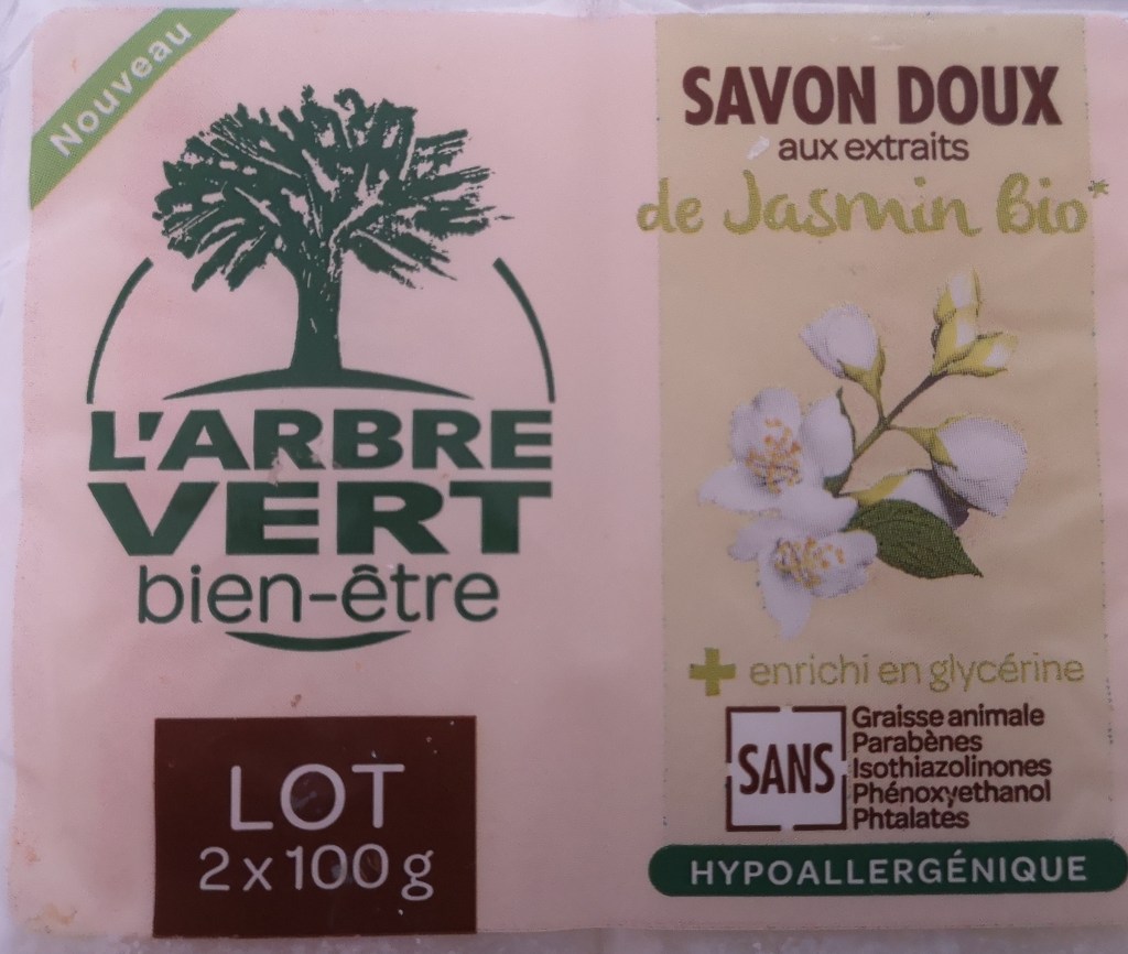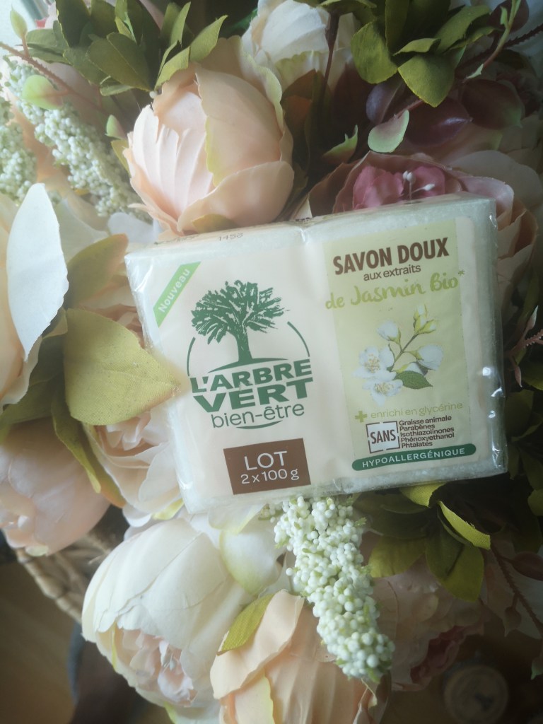Mon avis : Ce savon doux a une agréable odeur de Jasmin et sa composition est un gage de qualité. N’utilisant pas de savon au quotidien, je me suis servie de mes savons L’ARBRE VERT pour fabriquer une lessive maison bio qui sent super bon le Jasmin.